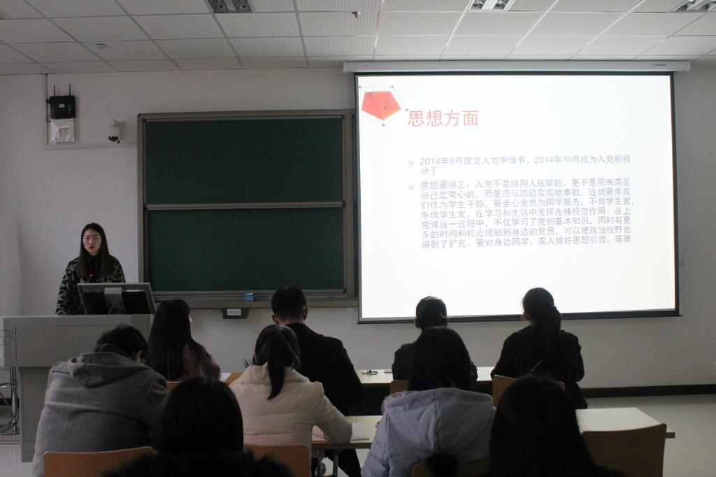 訾冉老師首先發(fā)言,希望各位黨員發(fā)展對象和入黨積極分子能夠利用這次匯報答辯的機(jī)會,進(jìn)一步增強(qiáng)黨性意識,提高黨性修養(yǎng),不斷進(jìn)行總結(jié)和完善自身,在思想上和行動上積極向黨組織靠攏。匯報答辯環(huán)節(jié),各位黨員發(fā)展對象就自己在校期間的個人經(jīng)歷、取得的成績、成為入黨積極分子后的表現(xiàn),以及今后的努力方向等方面進(jìn)行了匯報答辯。