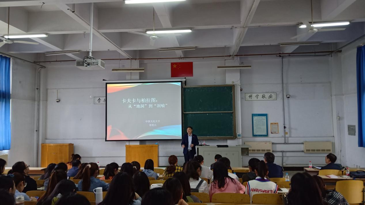 4月30日上午,中國人民大學(xué)曾艷兵教授應(yīng)邀在A合九教室為我院師生作“卡夫卡與柏拉圖從‘地洞’到‘洞喻’”的學(xué)術(shù)講座。本次講座由我院院長尤建設(shè)主持,我院專業(yè)老師和學(xué)生積極參加。