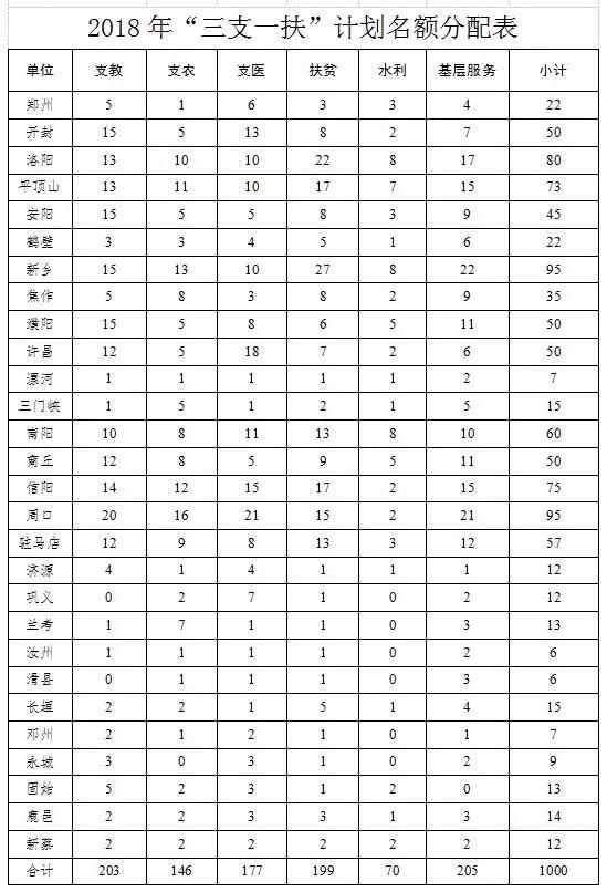 2018年全省共招募高校畢業(yè)生“三支一扶”計(jì)劃服務(wù)人員1000名,其中支教203名、支農(nóng)146名、支醫(yī)177名、扶貧199名、水利70名、社會(huì)保障基層服務(wù)205名。服務(wù)期限為2018年9月1日至2020年8月31日。
