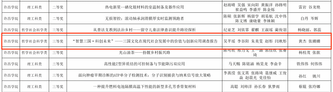 近日,由共青團河南省委、河南省教育廳、河南省人力資源和社會保障廳、河南省科學技術(shù)協(xié)會、河南省學生聯(lián)合會共同主辦的2025年“挑戰(zhàn)杯”河南省大學生課外學術(shù)科技作品競賽決賽評審結(jié)果公布。我院報送的作品《“智慧三國·科創(chuàng)未來”——三國文化在現(xiàn)代社會發(fā)展中的價值與創(chuàng)新應用調(diào)查報告》榮獲省級三等獎。該作品由黃杰、張姍姍兩位老師指導。