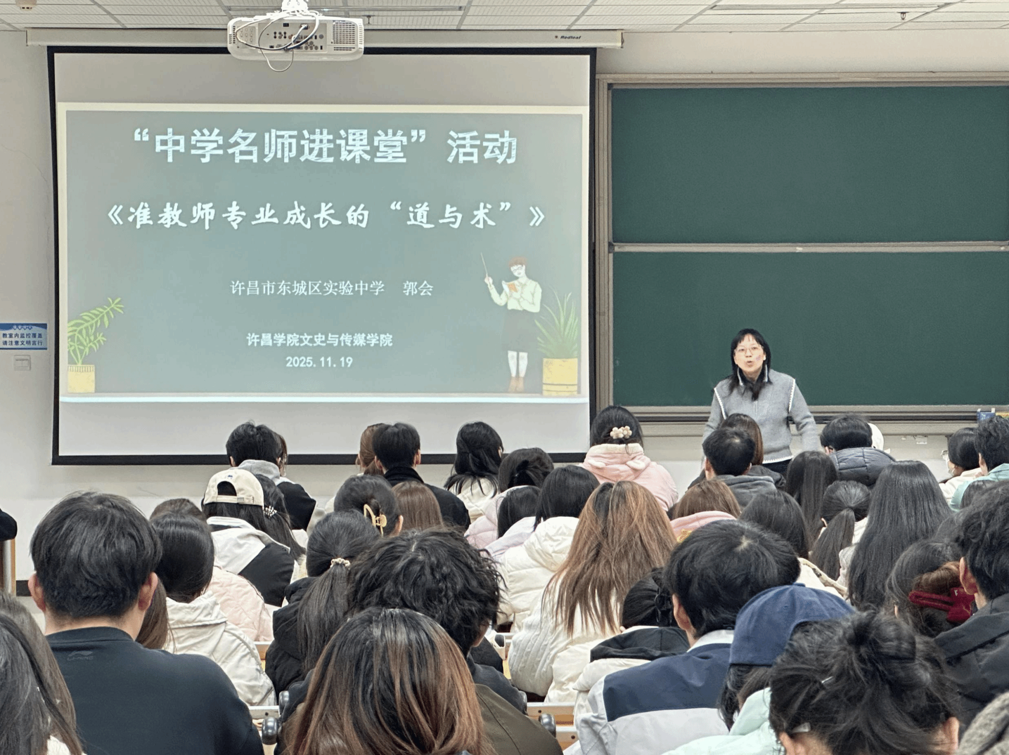 為進(jìn)一步提升我院師范生的專業(yè)水平與實(shí)踐能力, 11月19日晚,我院在文科樓E309舉辦“中學(xué)名師進(jìn)課堂”活動(dòng),此次活動(dòng)特邀許昌市東城區(qū)實(shí)驗(yàn)中學(xué)初中歷史名師郭會(huì)老師為歷史專業(yè)師范生作了題為《準(zhǔn)教師專業(yè)成長(zhǎng)的“道與術(shù)”》專題講座。我院副院長(zhǎng)韓啟振、歷史系教師孫靜華、袁旭陽(yáng)及歷史專業(yè)師范生參加活動(dòng)。