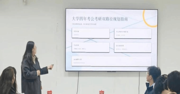 侯老師特別指出,2025年考公考研呈現(xiàn)新趨勢:考公崗位競爭加劇,命題更注重實(shí)際應(yīng)用能力;考研報(bào)名人數(shù)趨于穩(wěn)定,招生規(guī)模擴(kuò)大,更強(qiáng)調(diào)跨學(xué)科思維與綜合素質(zhì)。在互動(dòng)環(huán)節(jié),學(xué)生們圍繞“如何協(xié)調(diào)實(shí)習(xí)與備考”“選調(diào)生報(bào)考條件”“考研復(fù)試準(zhǔn)備要點(diǎn)”等問題踴躍提問,侯老師一一給予細(xì)致解答,并提供個(gè)性化規(guī)劃建議與資源推薦。